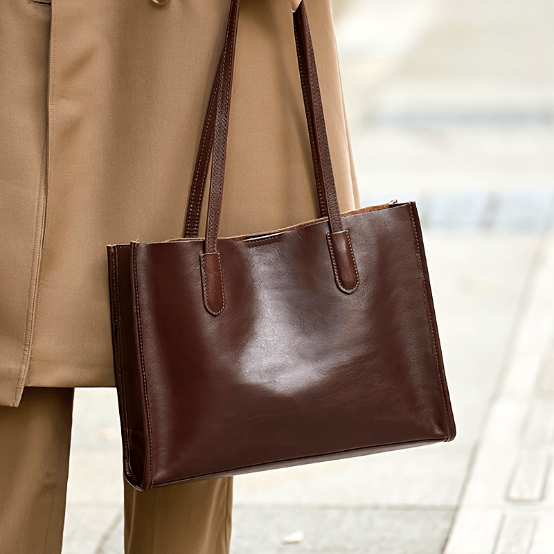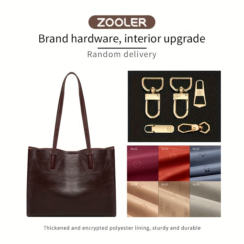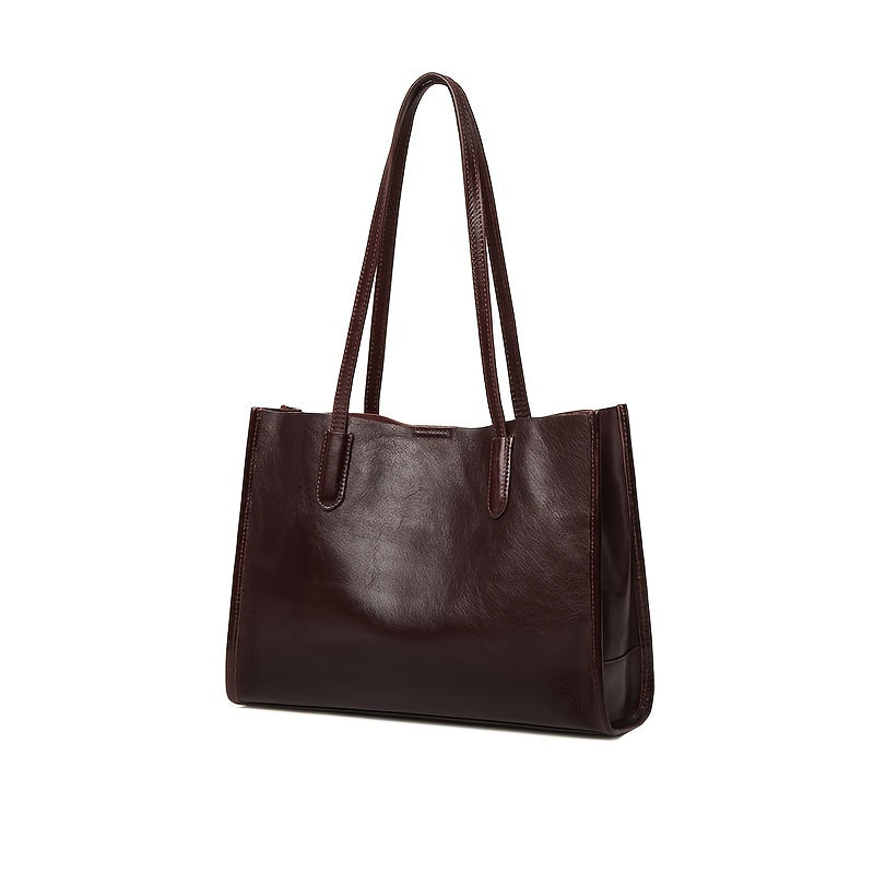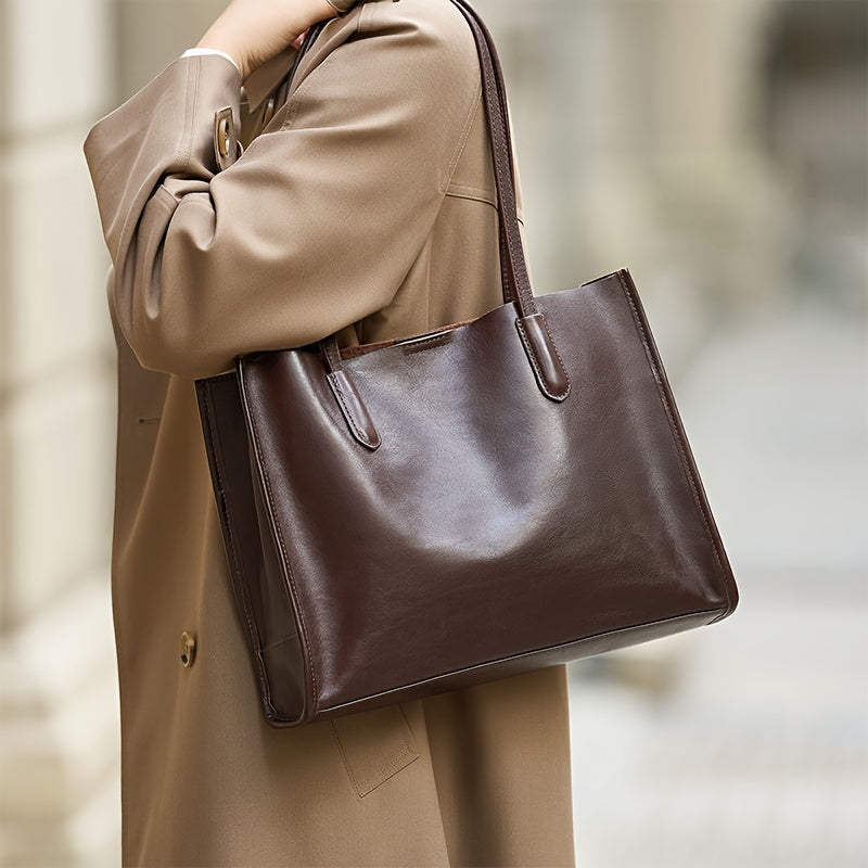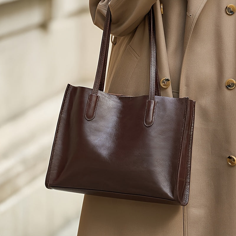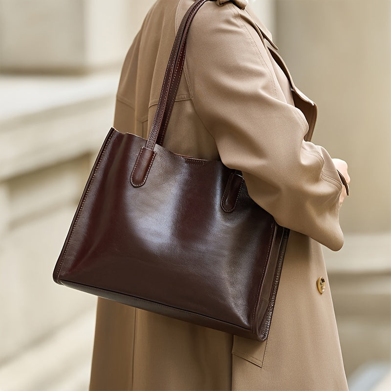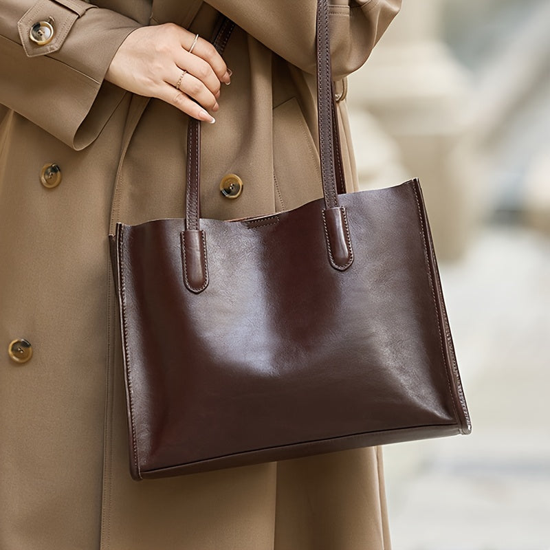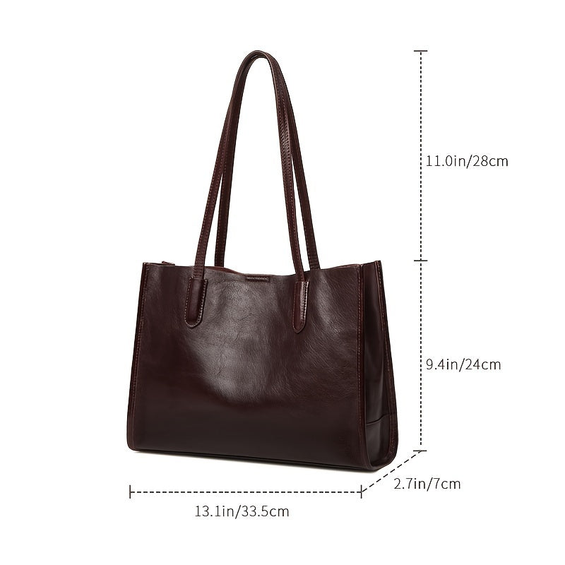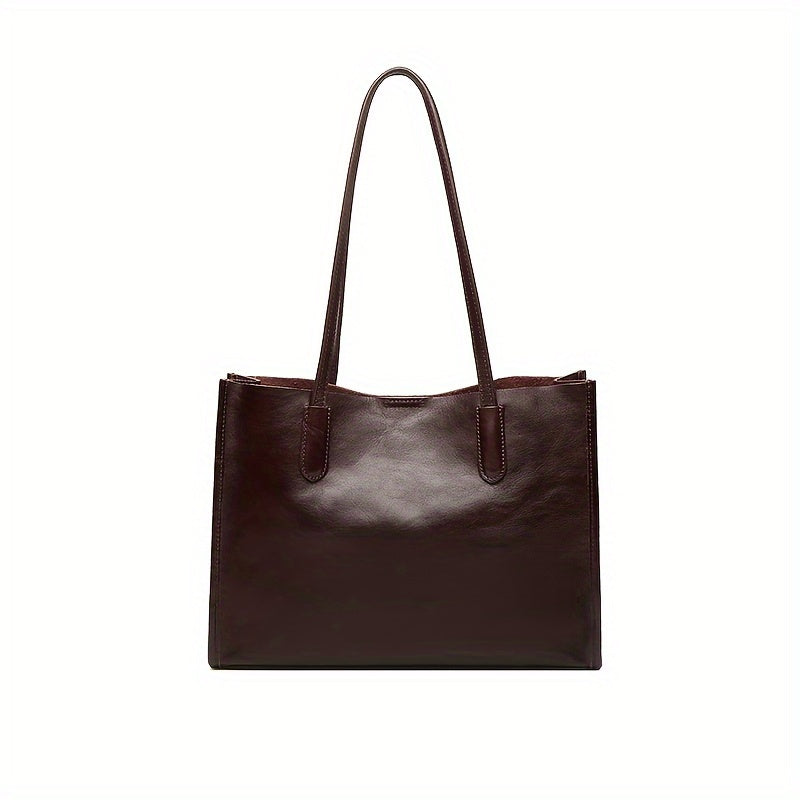 Genuine Genuine Leather Tote Bag for Women - Large Capacity Retro Shoulder Handbag with Magnetic Closure, Smooth Finish, and Fixed Strap in Coffee Brown\u002FBlack, Commuter Tote Bag | Minimalist Tote | Polyester Lined